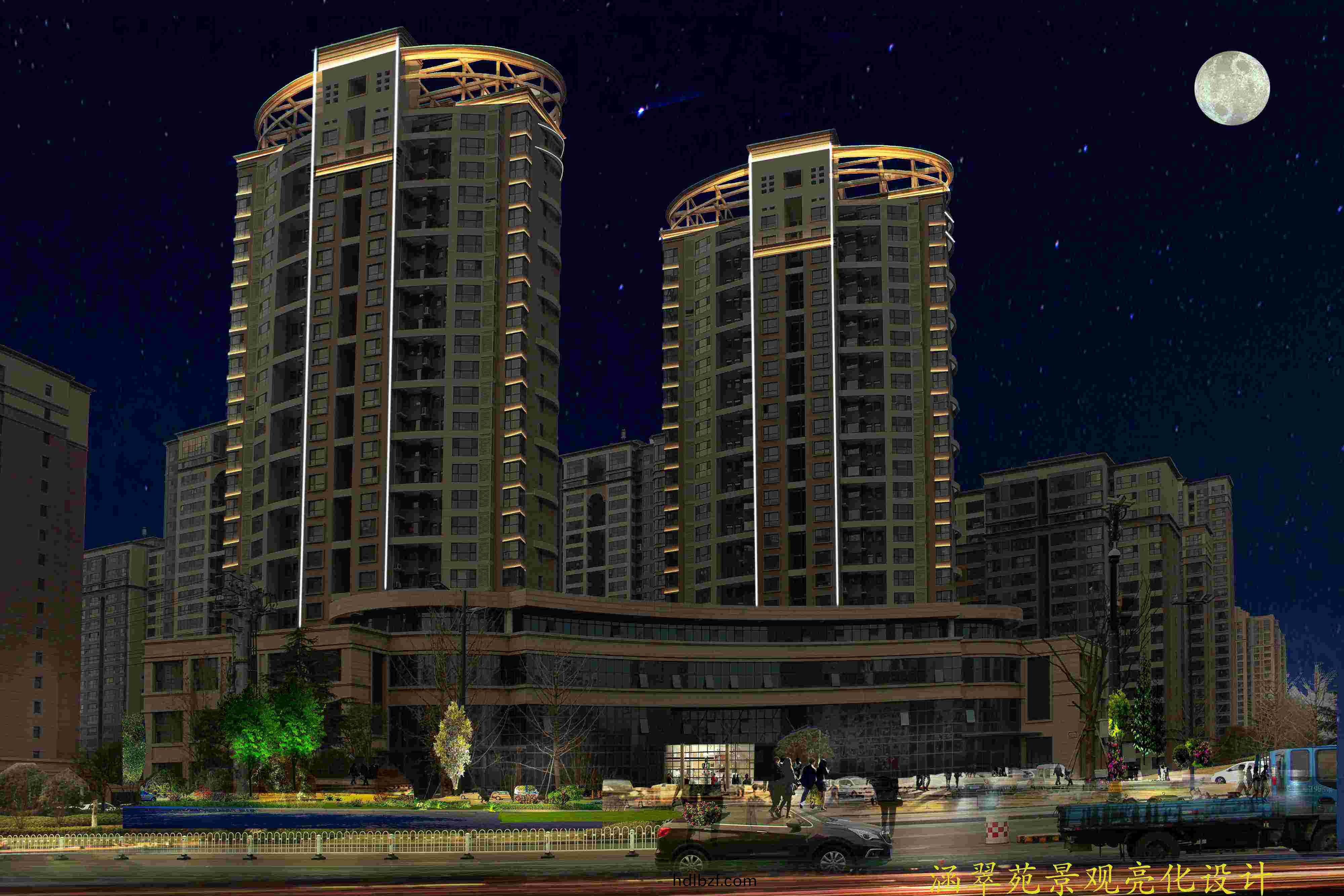 整體風格簡潔、大方,光色上以黃光爲主(zhu),煗白色爲輔,線(xian)條(tiao)簡潔明了(le),突齣建築物整體佈跼結構。